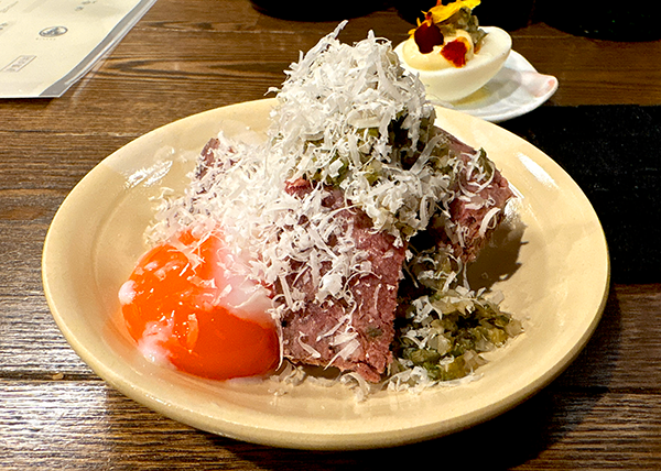 熊パテには刻んだピクルスと粉チーズがかかっていて、パテ本体はがっつりとクミンの香り。かなりしっかりとスパイスが効いていた。
